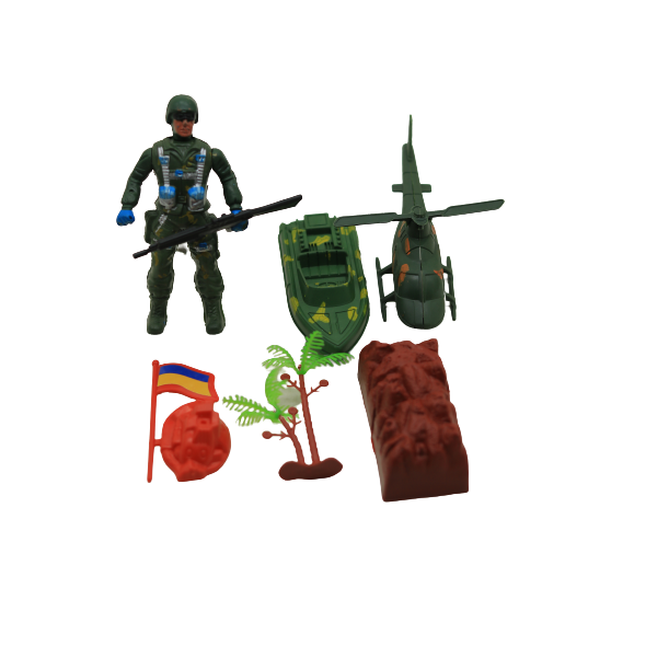 - المحتويات: جندي، بندقية، صخور، شجرة، قارب، مروحية، وعلم