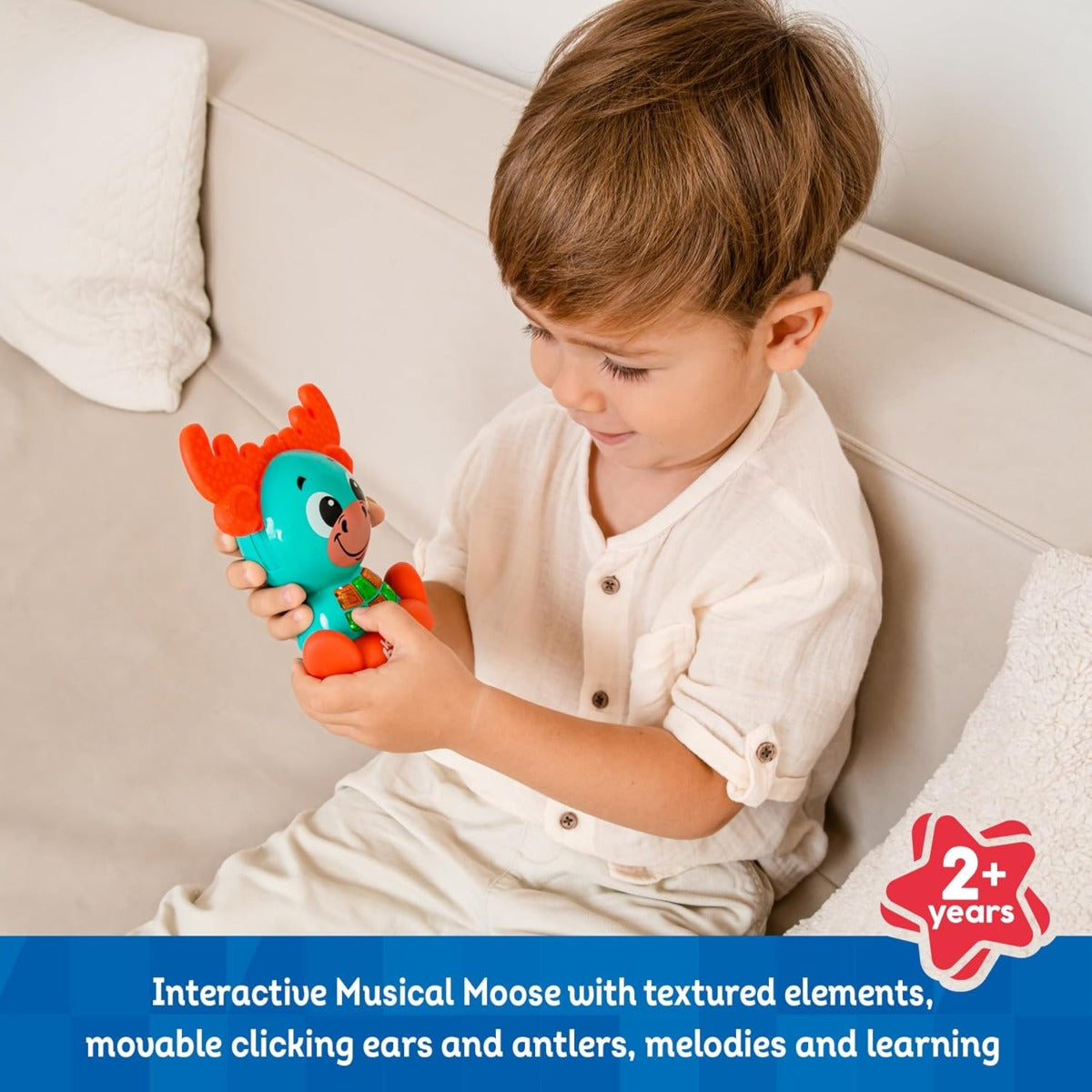 - شاهد عيون طفلك وهي تضيء بالإثارة أثناء تفاعله مع الأضواء الساطعة والآذان المتحركة ذات الملمس المميز والقرون الخاصة بحيوان الموظ المسلي.