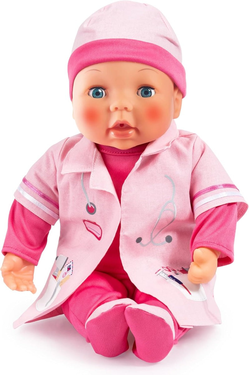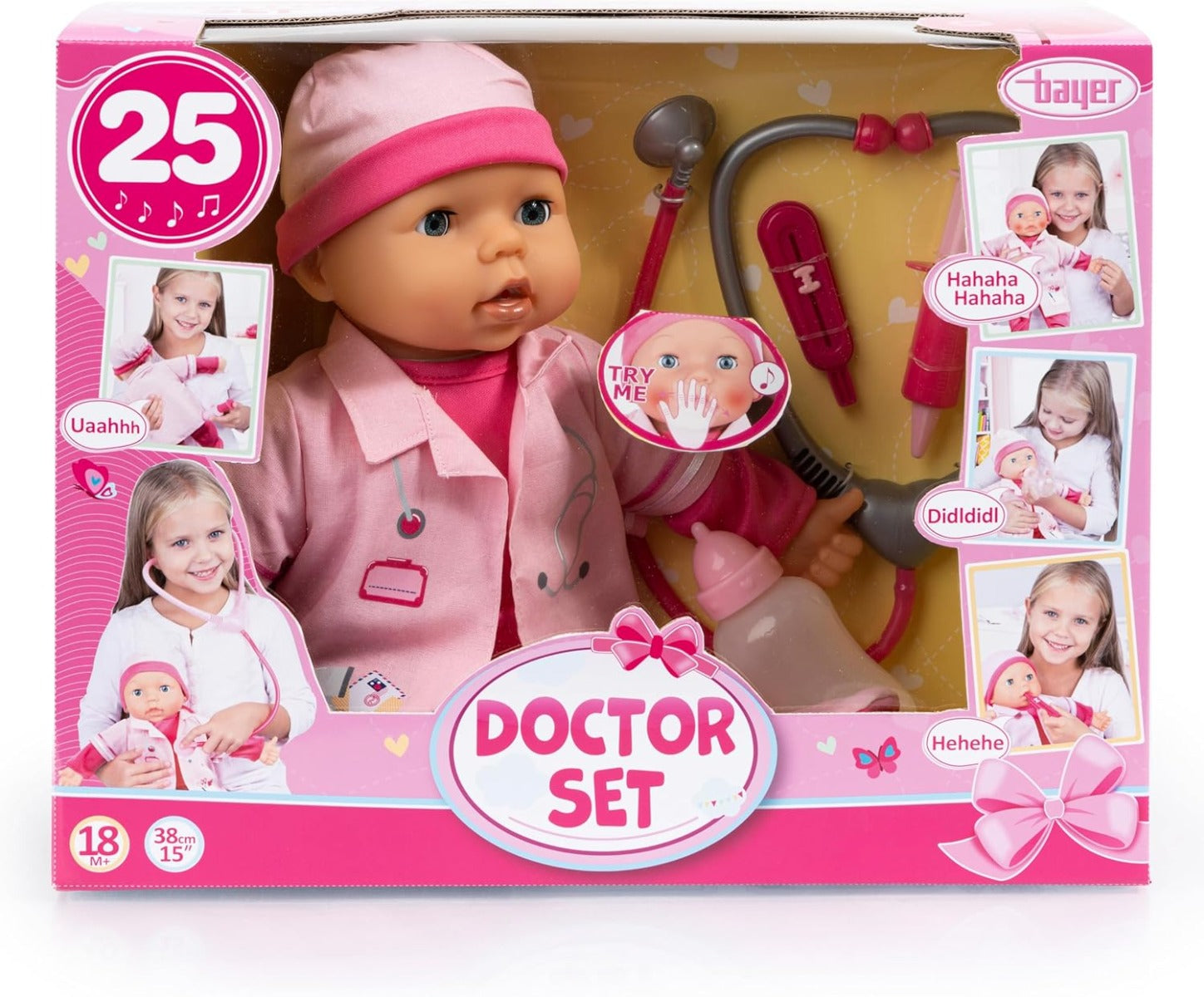 يتميز جهاز دكتور بيبي بطول 38 سم بوظائف متعددة ويأتي مع ملحقات. - إذا ضغطت على دمية الطبيب على بطنها، فإنها تصدر أصوات أطفال لطيفة