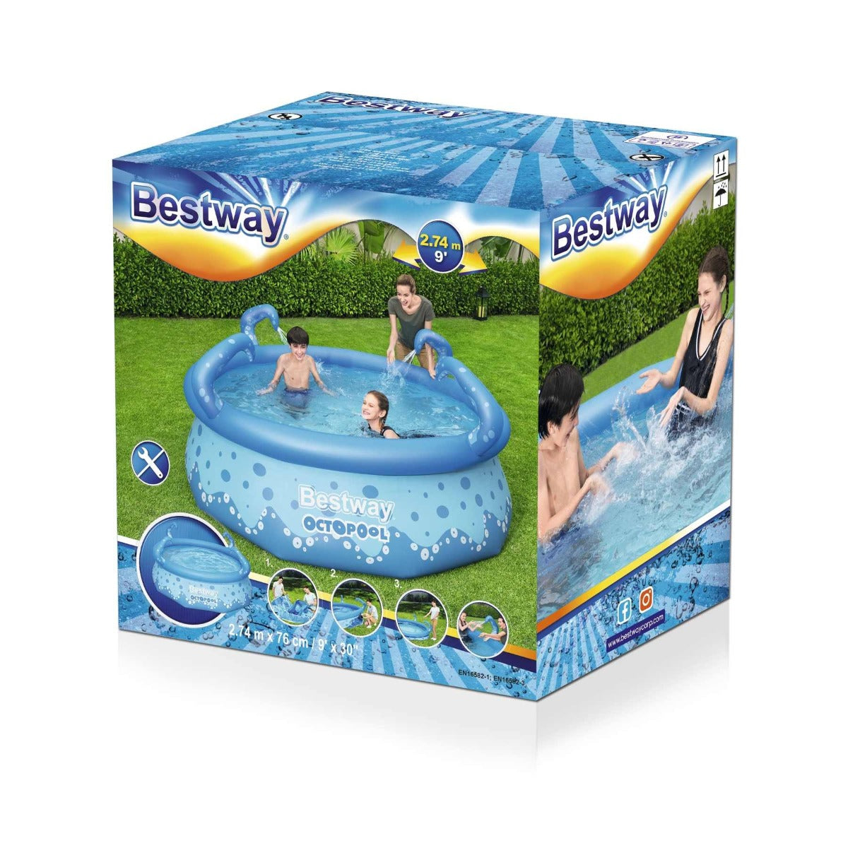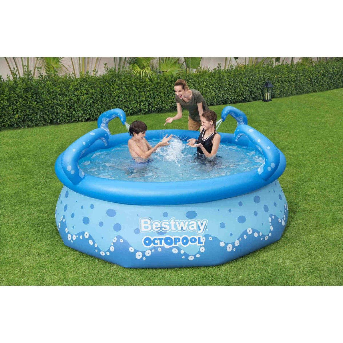 - تركيب سريع خلال 10 دقائق. جدران جانبية من Tritech™ - ثلاث طبقات من مادة PVC والبوليستر شديدة التحمل. بطانة مدعومة بحلقة علوية قابلة للنفخ. اختر سطحًا مستويًا، انفخ الحلقة العلوية، وسيرتفع مستوى المسبح عند ملئه بالماء. أربعة أذرع مزودة برشاشين مدمجين. ترش الأذرع القابلة للنفخ الماء عند توصيل خرطوم الحديقة. صمام تحكم مدمج في التدفق يُوصل بخرطوم الحديقة (مع محول مرفق) لتصريف الماء. سهل الطي والتخزين خارج الموسم. سعة الماء (80%): 3153 لترًا (833 جالونًا). رقعة إصلاح لاصقة تحت الماء. المحتويات: مسبح واحد، رقعة إصلاح.