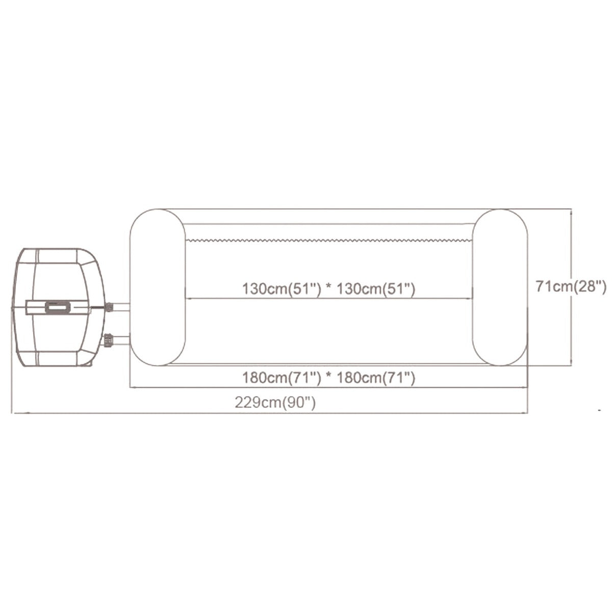 - الأبعاد: 180 × 180 × 71 سم (خارجي)، 130 × 130 سم (داخلي)