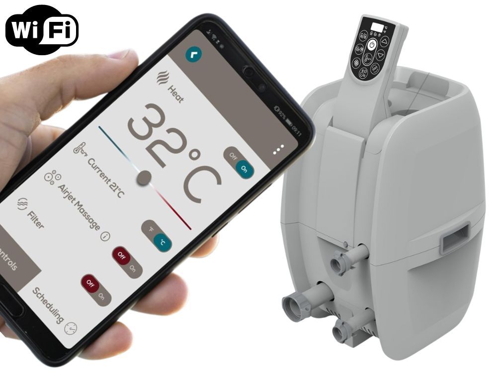 - يمكن التحكم في المنتجع الصحي عبر تطبيق على الهاتف. يتيح لك التطبيق ضبط درجة الحرارة المثالية، وتفعيل مؤقت توفير الطاقة، وتشغيل فلتر المياه، والتحكم في نظام التدليك AirJet Plus.