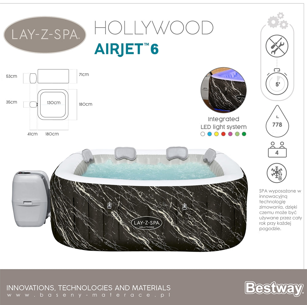 - حوض استحمام ساخن قابل للنفخ من بيست واي لاي-زي-سبا هوليوود، موفر للطاقة، فاخر، مزود بإضاءة LED، يتسع لـ 4-6 أشخاص، أبعاده 1.80 متر × 66 سم - رقم المنتج: 6001F