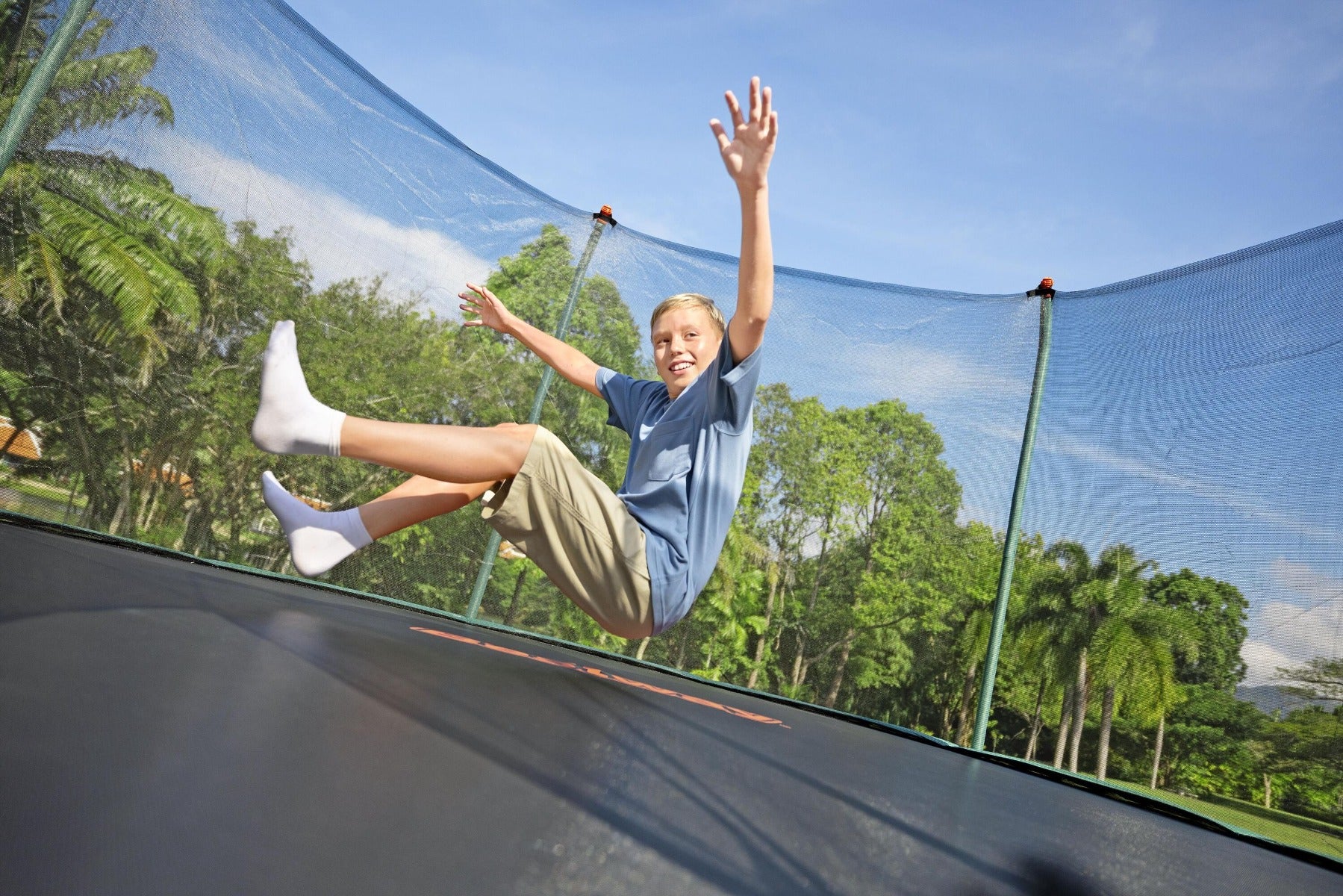ميزات السلامة: شبكة واقية حول المحيط بالكامل، أعمدة مبطنة، تثبيت أرضي معزز (5 نقاط تثبيت)، مواد مقاومة للأشعة فوق البنفسجية، أطراف أرجل قابلة للتثبيت، آمن
