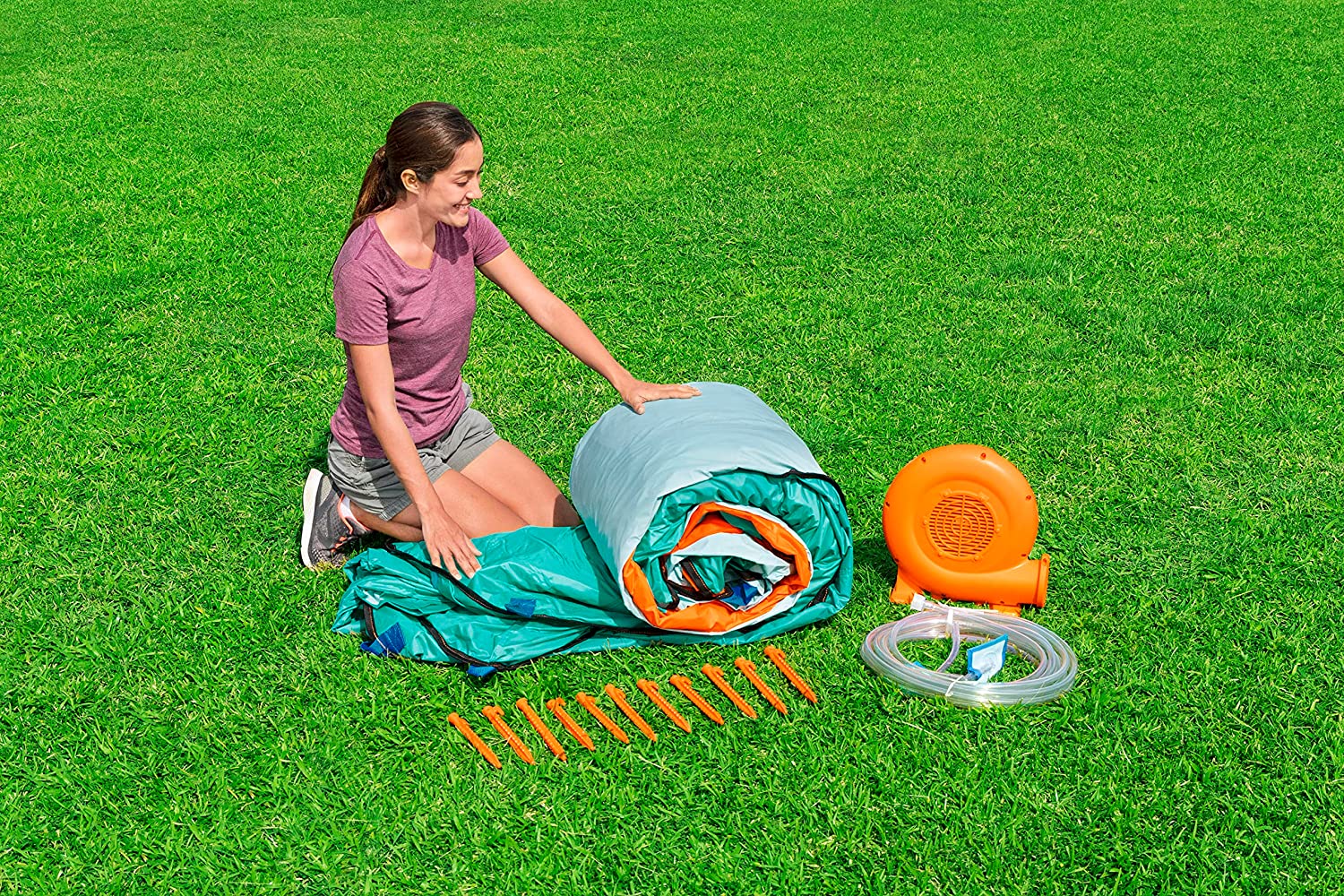 - يشمل: زحليقة، منفاخ، حقيبة تخزين، 11 وتدًا للحديقة المائية، خرطوم رش الماء.