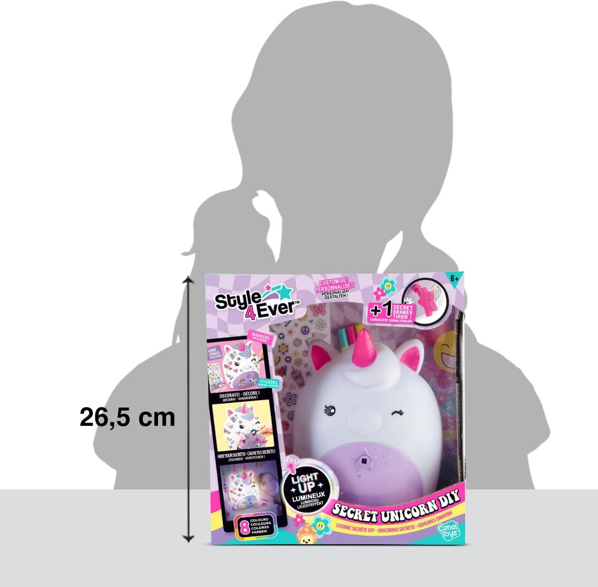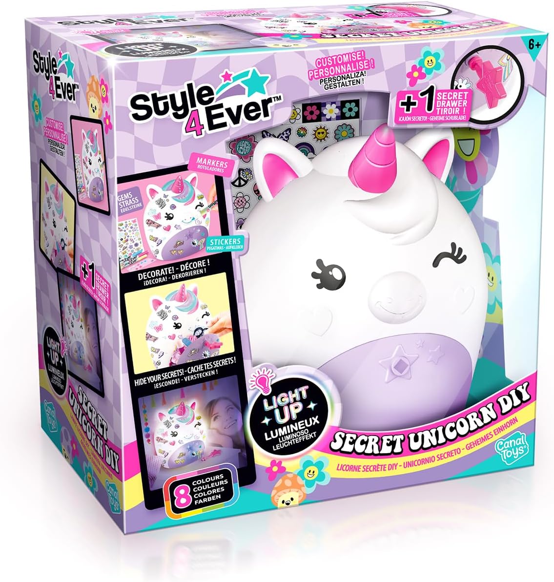 مصباح يونيكورن السري، مصباح ليلي LED يمكنكِ تزيينه بالملصقات وأقلام التلوين وأحجار الراين. درجُه السري مثاليٌّ لحفظ الأغراض الصغيرة (كالمجوهرات، وربطات الشعر، والمشابك، والعملات المعدنية) وإخفاء أسراركِ. أغلقيه بالمفتاح. نشاطٌ إبداعيٌّ وديكورٌ رائعٌ لغرفة مُحبي اليونيكورن. يتطلب بطاريتين AAA/LR03 بقوة 1.5 فولت (غير مُرفقتين). صُمِّم هذا المنتج في فرنسا للأطفال من عمر 6 سنوات فما فوق، وهو مُطابقٌ لمعايير الألعاب الأوروبية.