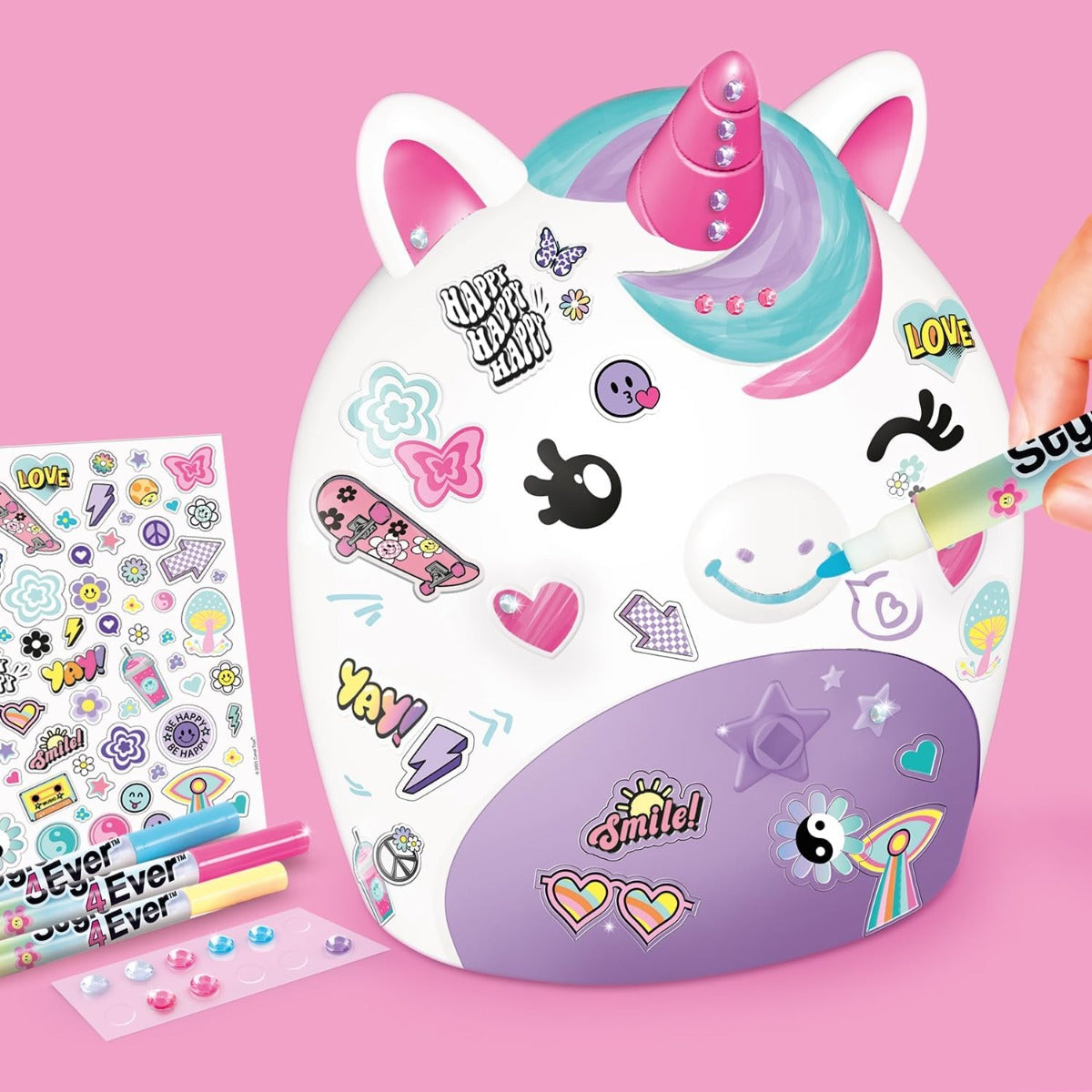 - المحتويات: 1 وحيد قرن مضيء سري، 1 مفتاح، 3 أقلام تلوين، 1 ورقة ملصقات لامعة، 1 ورقة أحجار الراين