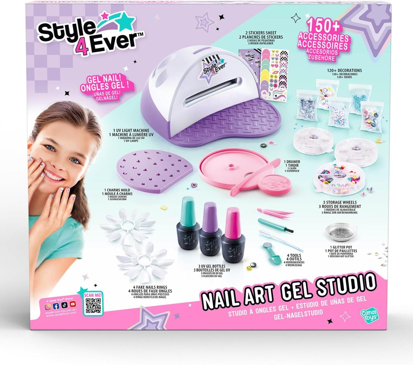- محتويات العلبة: يحتوي استوديو جل فن الأظافر من كانال تويز على مصباح للأشعة فوق البنفسجية، وطلاء أظافر، وأظافر صناعية، وبريق، وقلادات، وأكثر من 150 من إكسسوارات الأظافر الممتعة والآمنة والمناسبة للأطفال.