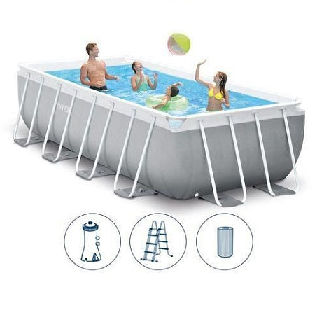 - المواصفات الفنية. مسبح إنتكس بريزم فريم 26788 فوق الأرض. سهل التركيب والفك، ذو هيكل متين. الأبعاد التقريبية بعد التركيب: 4.00 متر × 2.00 متر × 1.00 متر. مسبح بريزم فريم مستطيل الشكل مصنوع من الفولاذ المعالج المقاوم للصدأ والتآكل. مصنوع من مادة PVC مكونة من ثلاث طبقات: طبقة داخلية وطبقة خارجية من PVC سميك، وطبقة وسيطة من البوليستر. يأتي المسبح مع الملحقات التالية: مسبح إنتكس بريزم فريم 26788، مضخة فلتر خرطوشة 530 جالون/ساعة (الاستخدام الموصى به: 3-4 ساعات يوميًا)، سلم، فلتر خرطوشة