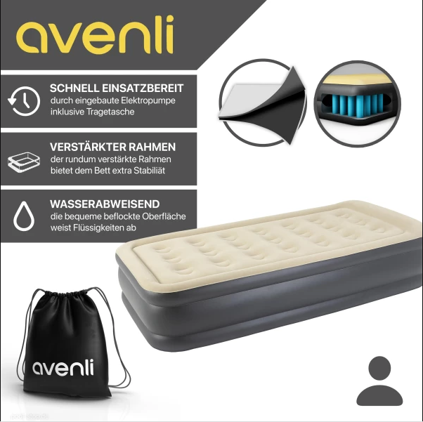 مرتبة جيلونغ أفينلي الهوائية ذاتية النفخ/سرير الضيوف هي الحل الأمثل لنوم مريح أثناء السفر. صُمم هذا السرير الفردي لاستيعاب شخص واحد، بحد أقصى للوزن 100 كجم. المرتبة مصنوعة من مادة PVC ومغطاة بطبقة مخملية من الفينيل المقاوم للماء، مما يجعلها متينة وسهلة التنظيف. تتميز المرتبة بهيكل زنبركي يوفر ثباتًا ممتازًا وراحة فائقة أثناء الاستلقاء. كما يضمن رافع الوسادة/اللوح الأمامي المدمج وضعية نوم مثالية. يسهل نفخ وتفريغ المرتبة بفضل المضخة الكهربائية المدمجة (220-240 فولت). تستغرق عملية النفخ والتفريغ من 3 إلى 4 دقائق فقط، ويبلغ حجم المرتبة بعد النفخ 196 سم طولًا، و97 سم عرضًا، و47 سم ارتفاعًا. يُنصح باستخدامها داخل المنزل، وهي متوفرة باللونين البيج والأسود. تتضمن المرتبة حقيبة حمل وملصق إصلاح. بشكل عام، تُعد مرتبة جيلونغ أفينلي الهوائية ذاتية النفخ/سرير الضيوف حلاً مثالياً لأي شخص يبحث عن سطح نوم مريح وداعم أثناء السفر. إنها خيار ممتاز لمن يحتاجون إلى