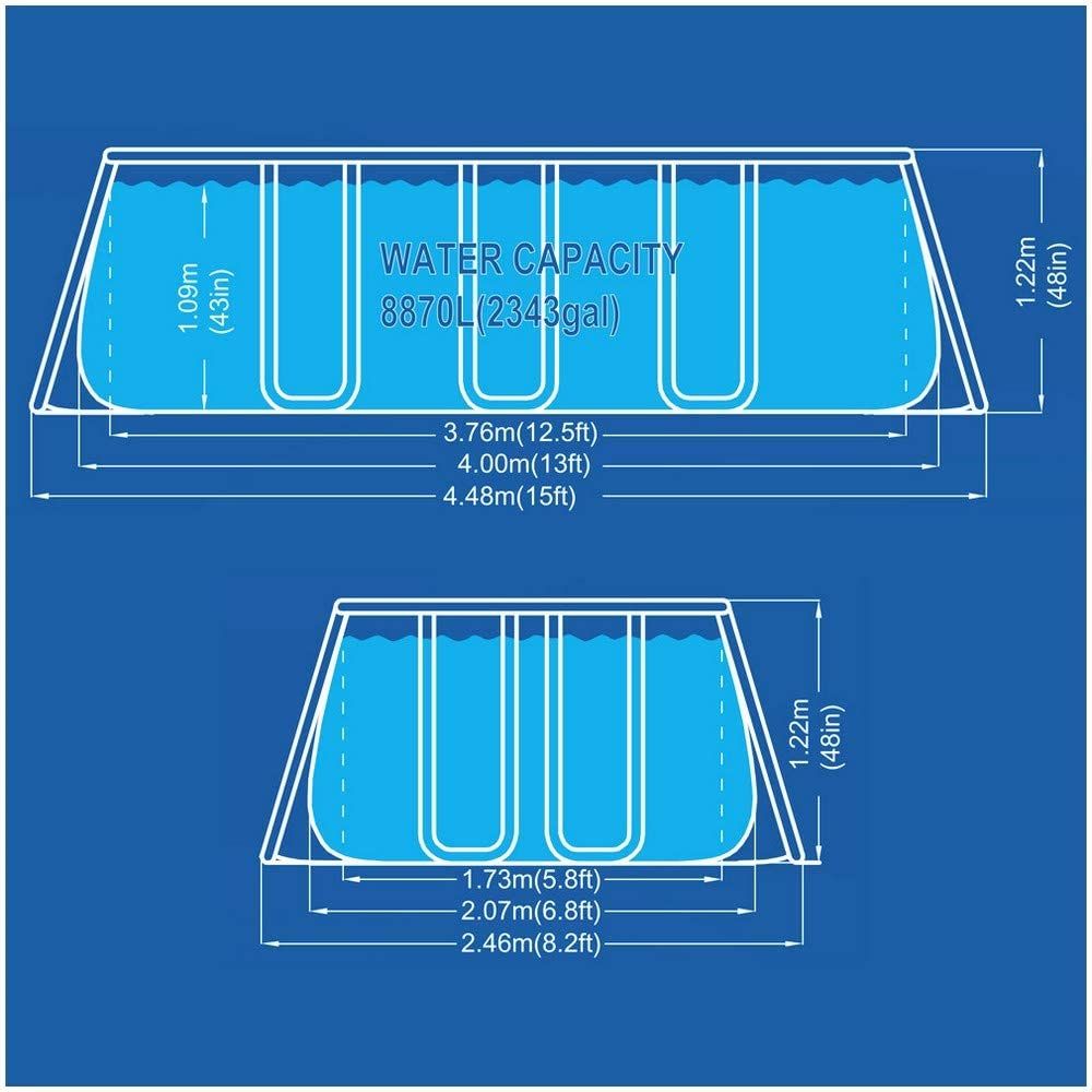 - المواصفات: الطول 400 سم، العرض 207 سم، الارتفاع 122 سم، سعة الماء 80% (8870 لترًا)، تركيب سريع