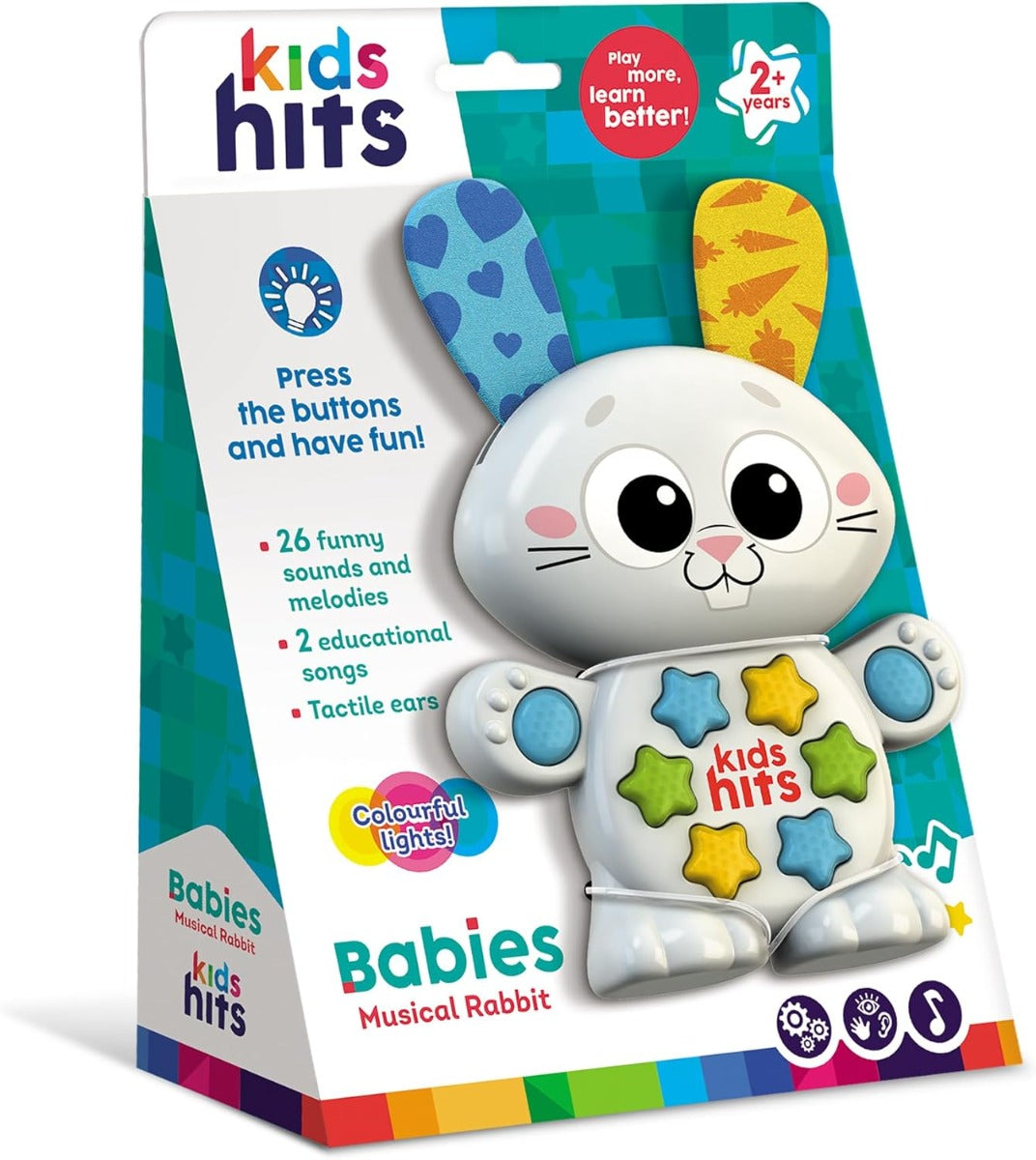٢٦ صوتًا ولحنًا مرحًا، أغنيتان تعليميتان، آذان ملموسة، أضواء ملونة - تُضفي ألعاب الموسيقى والأصوات بهجةً كبيرةً على الأطفال! سيُظهر الصغار مواهبهم الموسيقية باللعب مع الأرنب الموسيقي، مُرددين الألحان الشعبية وأغاني الحروف الأبجدية وأغاني العد مع "صديقهم المُبهج". سيتعلم الأطفال الصغار الرقص، مُتمايلين من جانب إلى آخر، ونقر أقدامهم برفق على أنغامهم المُفضلة. استمتعوا بالموسيقى واكتسبوا المعرفة الأولى!