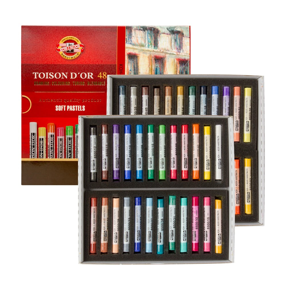 - تتضمن هذه المجموعة من كوهينور 48 لونًا من أقلام الباستيل الناعمة المستديرة من تويسون دور. يبلغ طولها 37 مم، أي نصف حجم قلم الباستيل القياسي، وهي غير مغلفة بورق. تشتهر أقلام باستيل كوهينور بجودتها العالية، فهي سهلة الاستخدام وتتمتع بثبات ممتاز للألوان. يمكن استخدامها منفردة أو مع قلم رصاص ميكانيكي بقطر 9 مم/حامل متعدد الاستخدامات. يُنصح بوضع مثبت على الرسمة النهائية للحفاظ على الألوان.