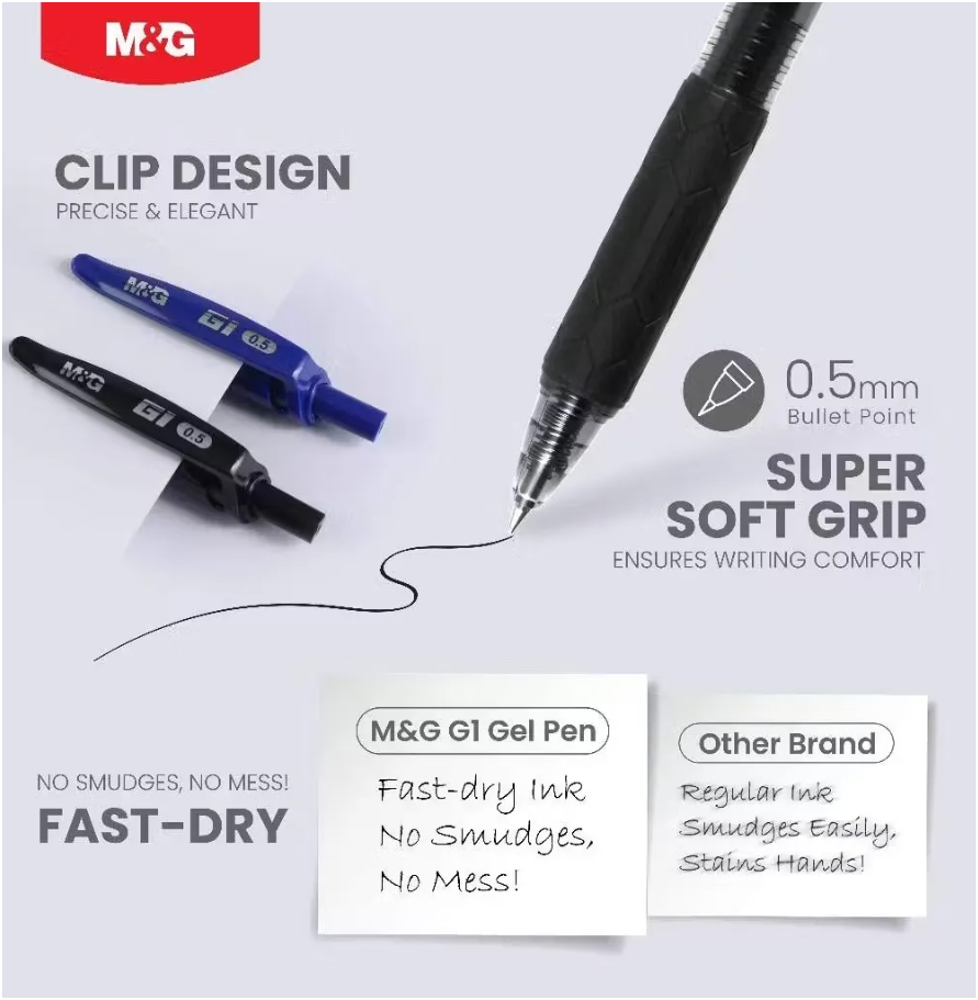 - يتميز قلم M&G G1 Gel Pen بتصميم أنيق مزود بمشبك وآلية قابلة للسحب، مما يجعله أنيقًا وعمليًا في آن واحد، ويوفر تجربة كتابة مميزة.