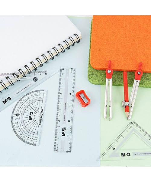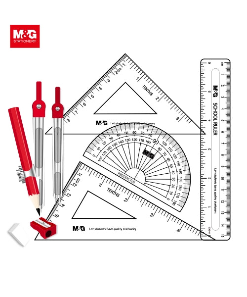 - ممحاة، مبشرة، مسطرة 15 سم، مثلث قائم الزاوية، مثلث، منقلة، بوصلة، بوصلة مع محول وقلم رصاص،