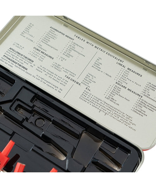 - مجموعة أدوات الرياضيات كاملة في علبة معدنية واحدة: بوصلتان + مسطرة 15 سم + مسطرتان مثلثتان + منقلة 180 درجة + ممحاة