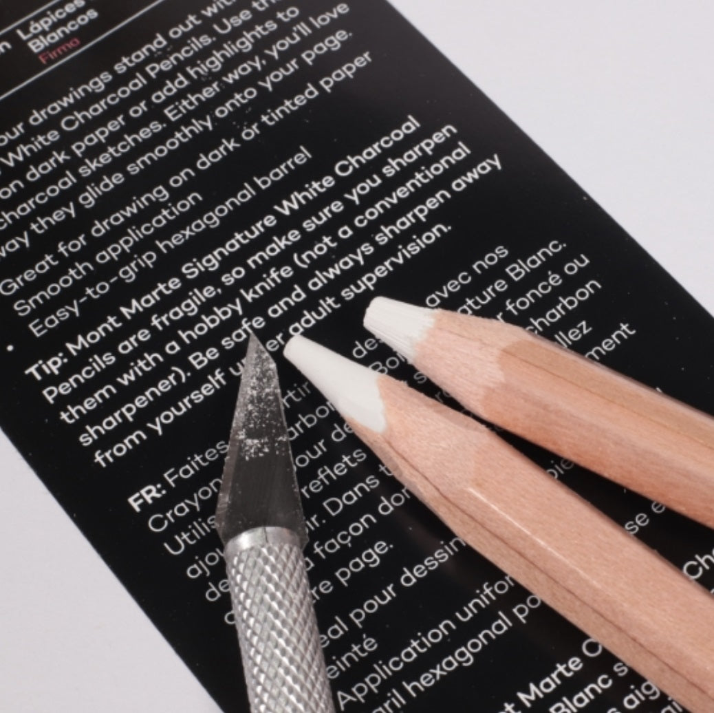 - تُعد هذه المجموعة المكونة من قلمين من أقلام مونت مارت البيضاء المصنوعة من الفحم مثالية للاستخدام على الورق ذي اللون الداكن، ويمكن استخدامها أيضًا مع وسائط الرسم الأخرى.