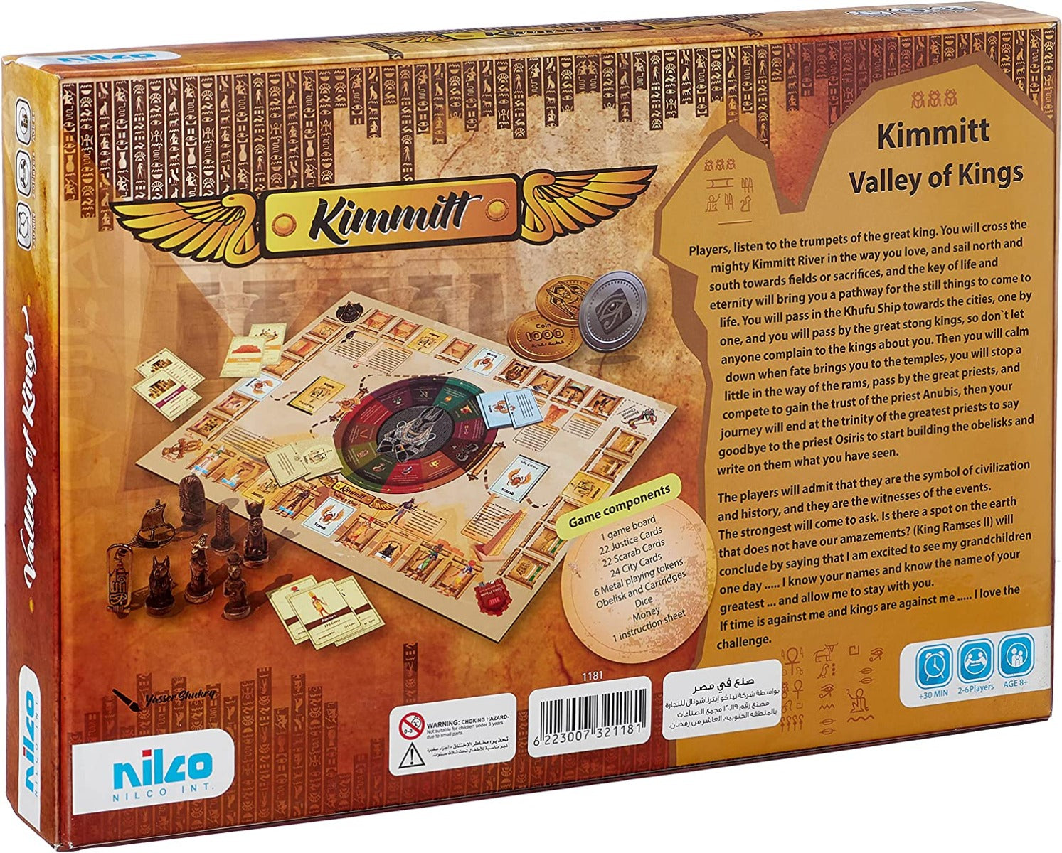 لعبة نيلكو كيميت الفراعنة الإنجليزية - رقم 1181 - لعبة شيقة ومليئة بالتحديات، توفر ساعات من المرح. تدور أحداث اللعبة في مصر القديمة، والهدف هو أن يكون اللاعب الأكثر ثراءً في نهاية اللعبة. تتضمن مكونات اللعبة لوحة اللعب، و22 بطاقة عدالة، و22 بطاقة جعران، و24 بطاقة مدينة، و6 قطع لعب معدنية، ونرد على شكل مسلة وخراطيش، وورقة تعليمات واحدة. تُظهر لوحة اللعبة نهر كيميت الشهير والرحلة التي سيخوضها اللاعبون عبره إلى المدن. ومع تقدمهم، يتنافس اللاعبون لكسب ثقة الكاهن أنوبيس وبناء المسلات لكتابة حكاياتهم المذهلة. كما يجب على اللاعبين توخي الحذر من إغضاب الملوك، وإلا فقد تنتهي رحلتهم قبل الأوان. تُعدّ هذه اللعبة مثالية لتنمية خيال الأطفال ومهاراتهم اليدوية، فضلاً عن تحسين قدراتهم الحركية والتنسيق بين اليد والعين. إنها ستُضفي ساعات من المرح والتسلية على جميع أفراد العائلة. فلنبدأ الرحلة ولنُتقن التحدي.