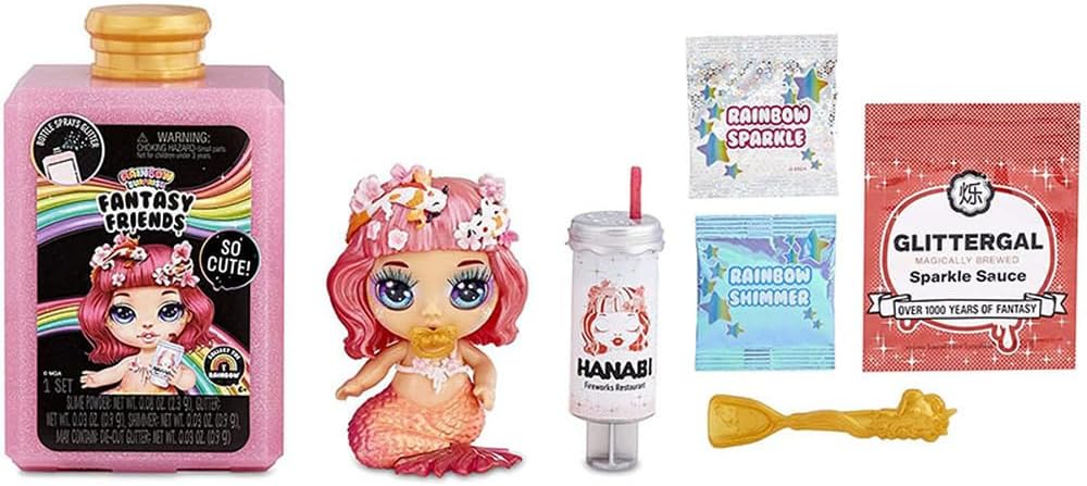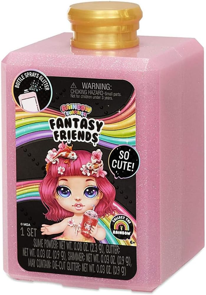 أصدقاء الخيال من رينبو سربرايز هم دمى صغيرة ساحرة ورائعة تُطلق مادة لزجة وتُصدر بريقاً! افتح عبوة العطر الجميلة بالضغط على الجزء العلوي.