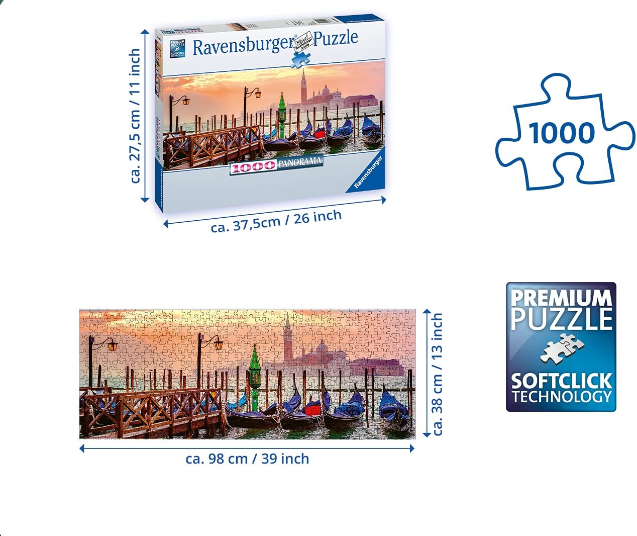 - أحجية تركيب الصور (بازل) من رافنسبورغر مكونة من 1000 قطعة، مناسبة للبالغين؛ يبلغ حجمها بعد الانتهاء حوالي 98 × 37 سم