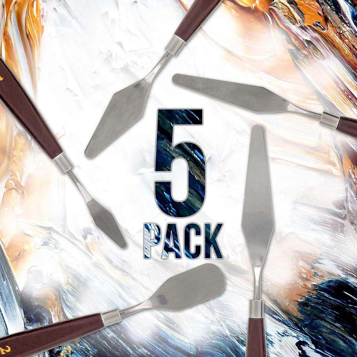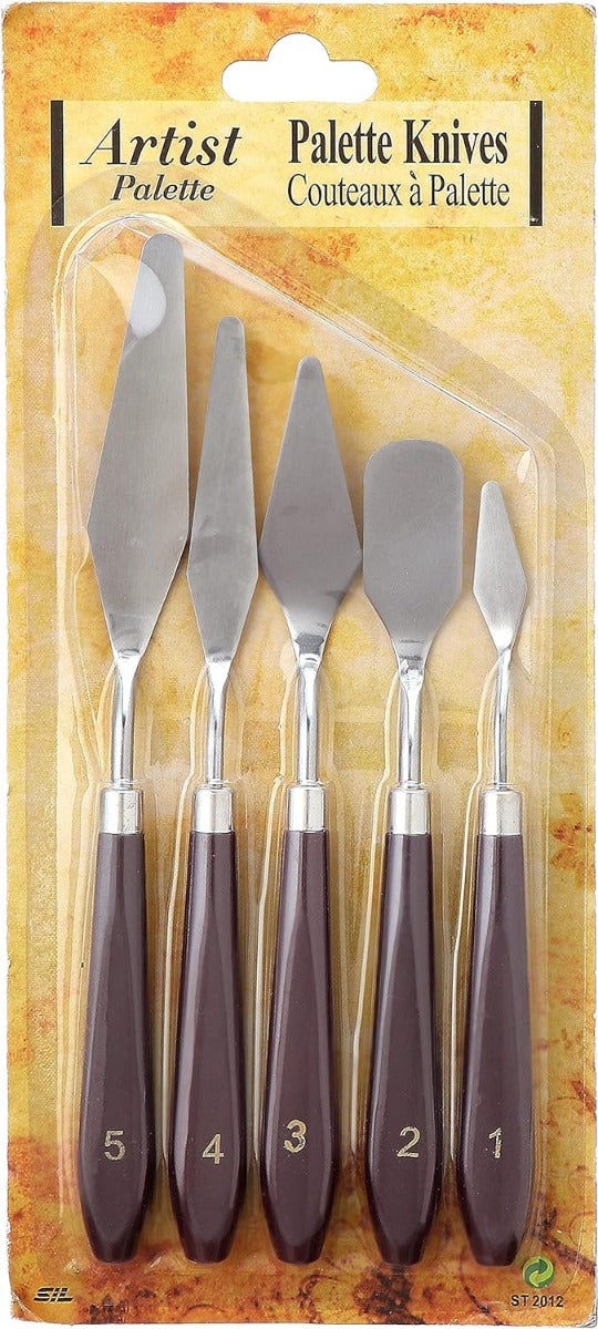 - طقم سكاكين رسم فنية فاخر من الفولاذ المقاوم للصدأ، مكون من 5 قطع، بمقابض خشبية متينة ومريحة. يتضمن الطقم الأشكال والأحجام الأساسية اللازمة لمعظم تقنيات الرسم بالسكاكين وتطبيقات الرسم المختلفة.