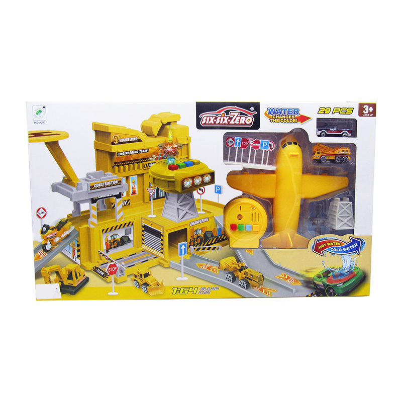 - محطة بناء رائعة مزودة بمنحدرات مضيئة وصوتية، ومركبتين يتغير لونهما بتغير درجة حرارة الماء الساخن والبارد. بالإضافة إلى طائرة لنقل السيارات. أبعاد العبوة: 68 سم × 39 سم × 9 سم.