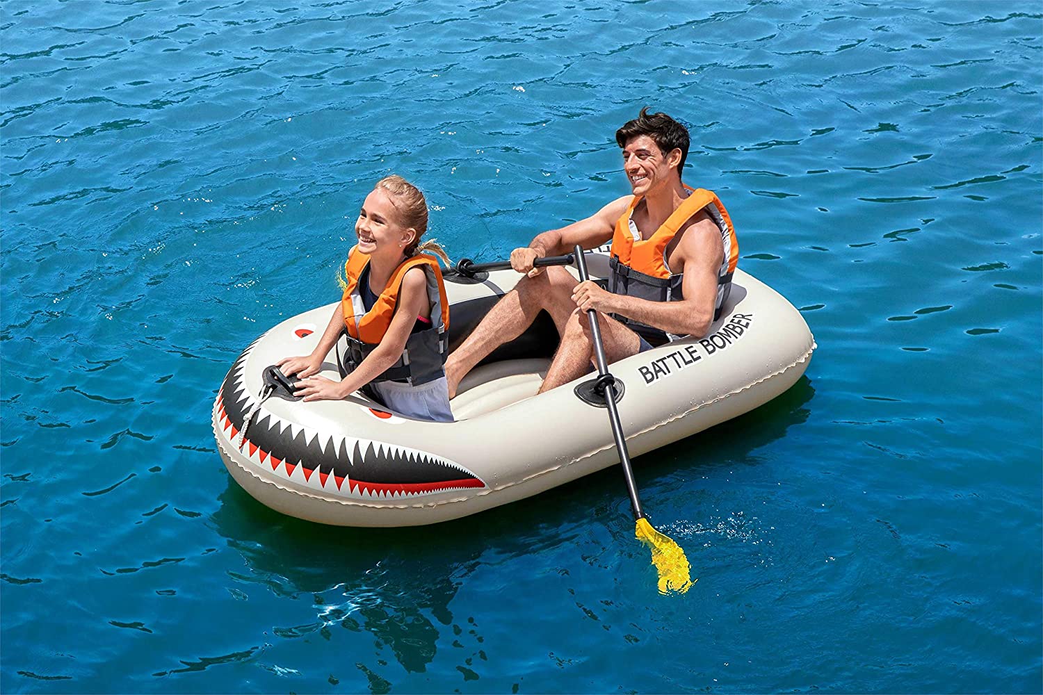 - The Battle Bomber Raft comes with two 49 inch oars, as well as oar locks and clasps to hold them in place and allow for a smooth paddle.