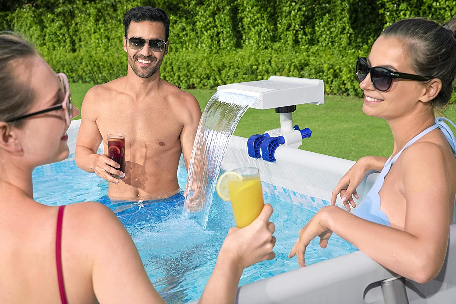 - Thanks to the cascade of water that this Bestway accessory generates, your pool experience will be even more magical: you can enjoy a light show as you swim after sunset, with the multicolored rays shining through the fountain and illuminating your swimming pool. night.