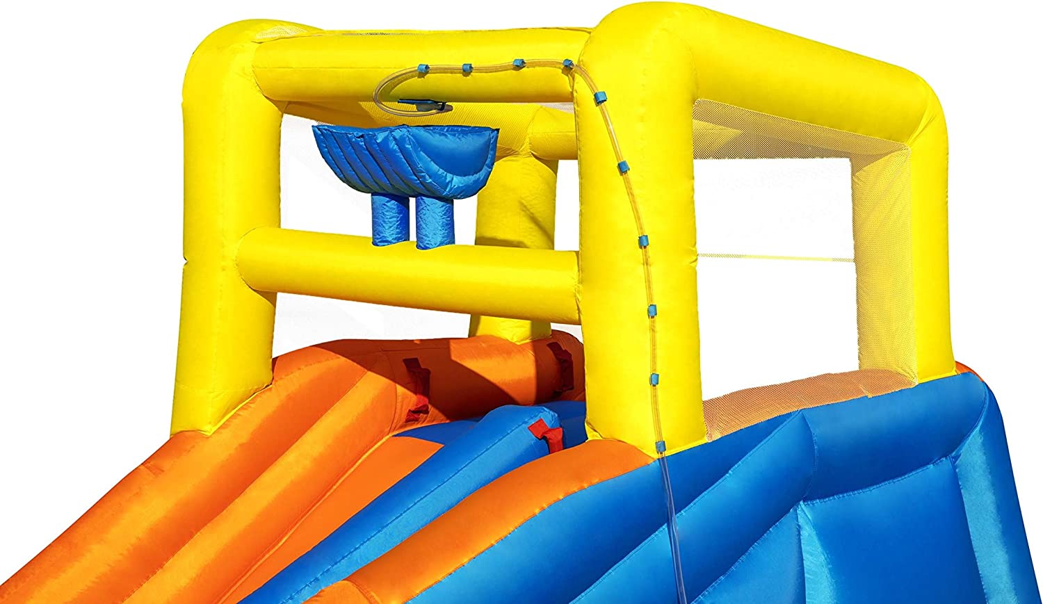 - Contents: 1 slide, 1 blower (stakes included), 1 repair kit (multiple assorted patches), 1 storage bag, 10 bouncer stakes, 1 water spraying hose, 1 basketball