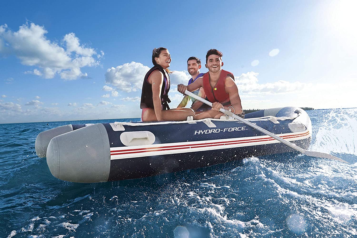- 4 seater inflatable sports boat that is perfect for fishing or open water swimming.