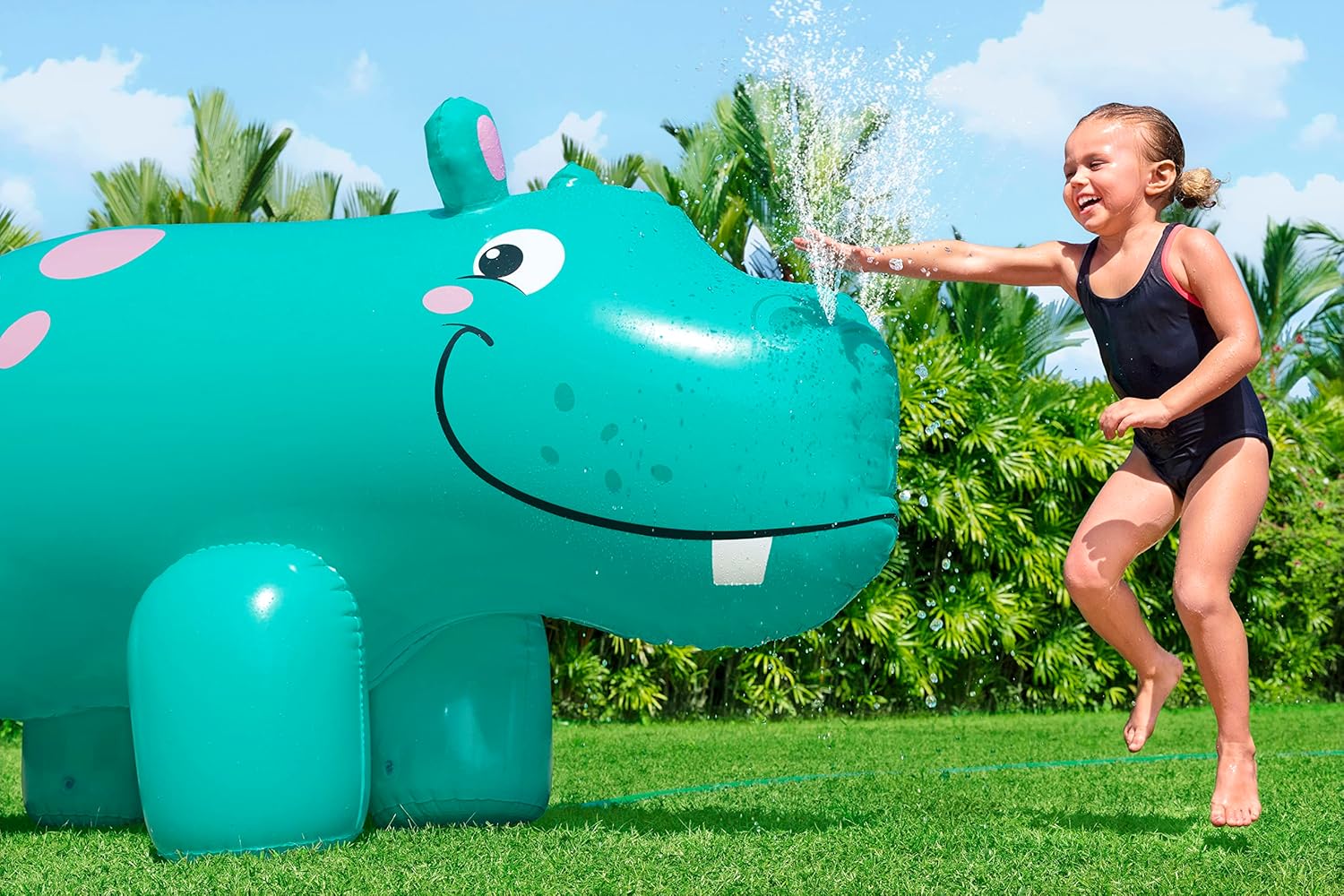 Bestway Jumbo Hippo Kids Inflatable Sprinkler: - Your child's summer playtime is about to get super-sized with the Jumbo Hippo Sprinkler! Designed for children ages 2 and up, this hippo-shaped sprinkler is 2 meters long! With two sprinkler spouts, one coming out of each snout, your child will delight in the happy hippo design as they laugh and play in the sunshine.
