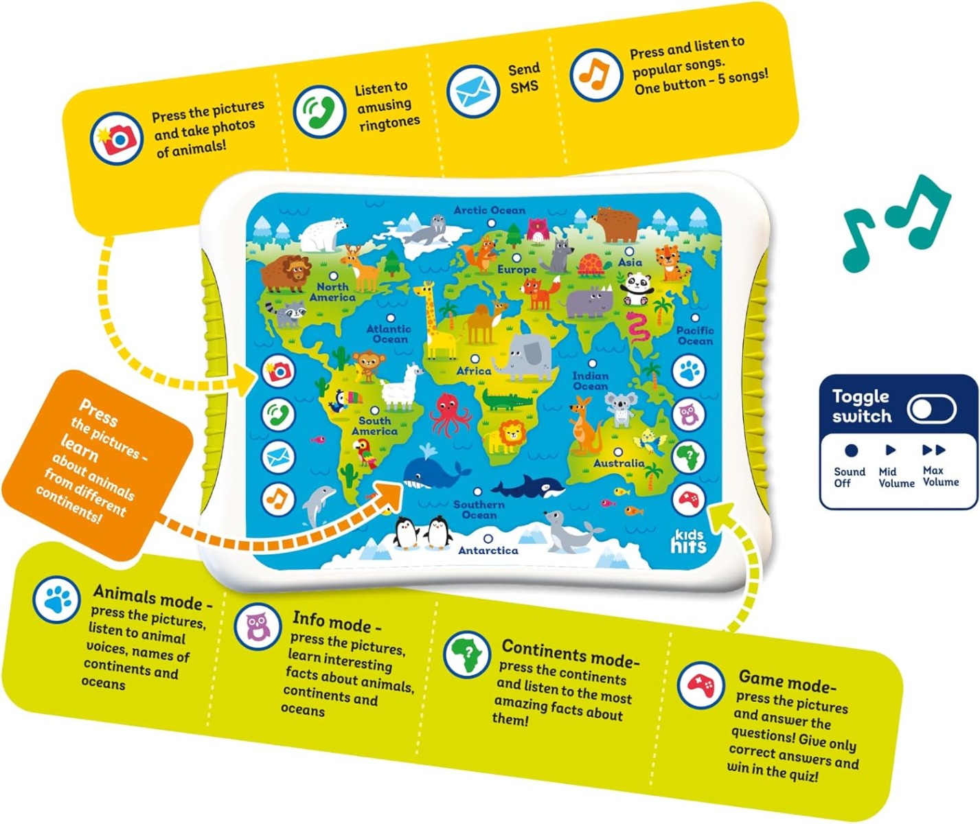 - animals mode (discover animal sounds, learn the names of continents and oceans);