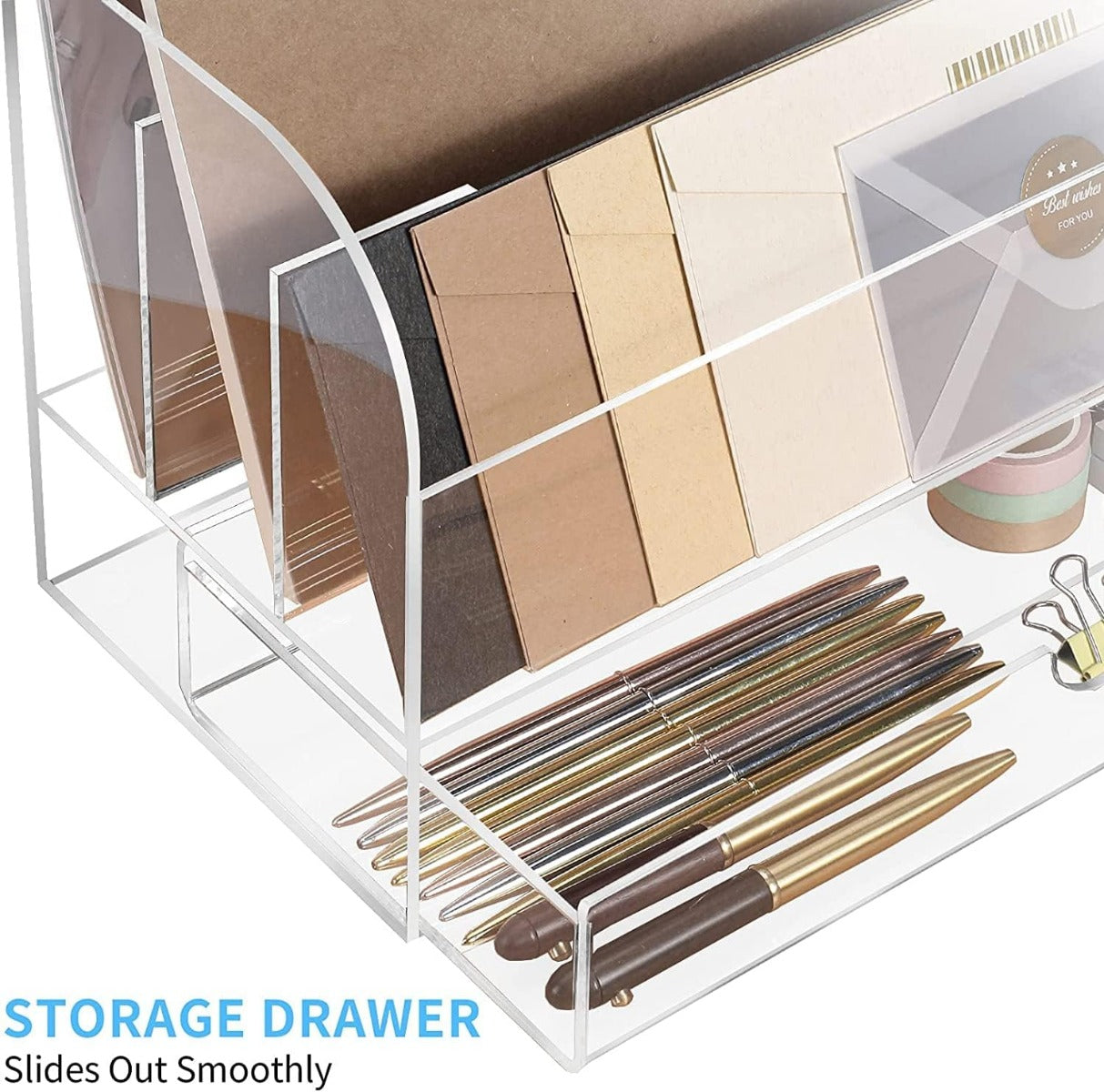 - Multiple Space for Everything: (33x16x20cm), 3 slots and 1 drawer clear desk organizer with well-thought out dimensions for your desk accessories that keep the stuff you need at hand.