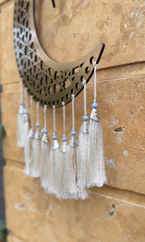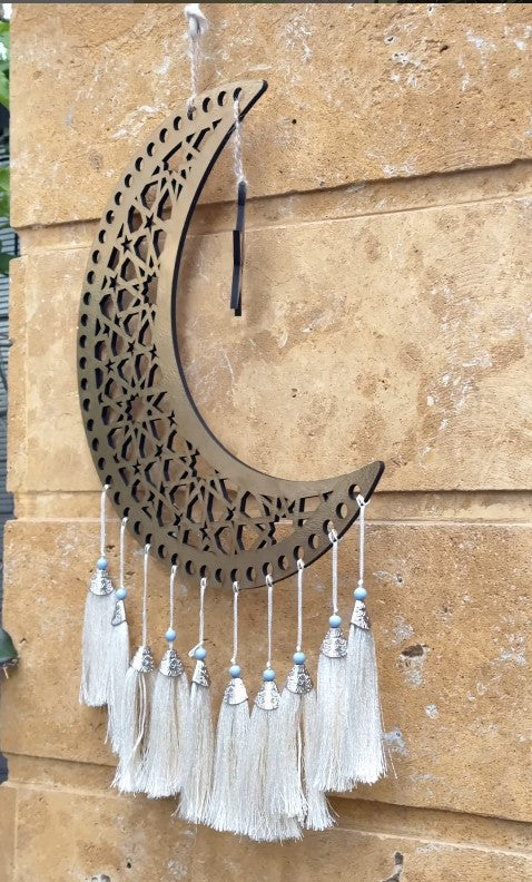 - HANDCRAFTED DETAILS: Intricately designed with traditional Arabic calligraphy, featuring three crescent moons and matching star pendants